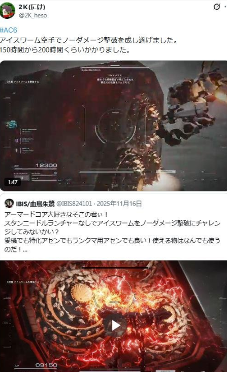 1月6日,日本视频作者2K在社交媒体上传了一段令人瞠目结舌的实机演示:他操控机甲完全没用任何热兵器,仅凭机体的近战体术,不仅成功击杀了游戏中体型庞大且拥有多重护盾机制的Boss“冰蠕虫”,更离谱的是全程保持了“无伤”状态。